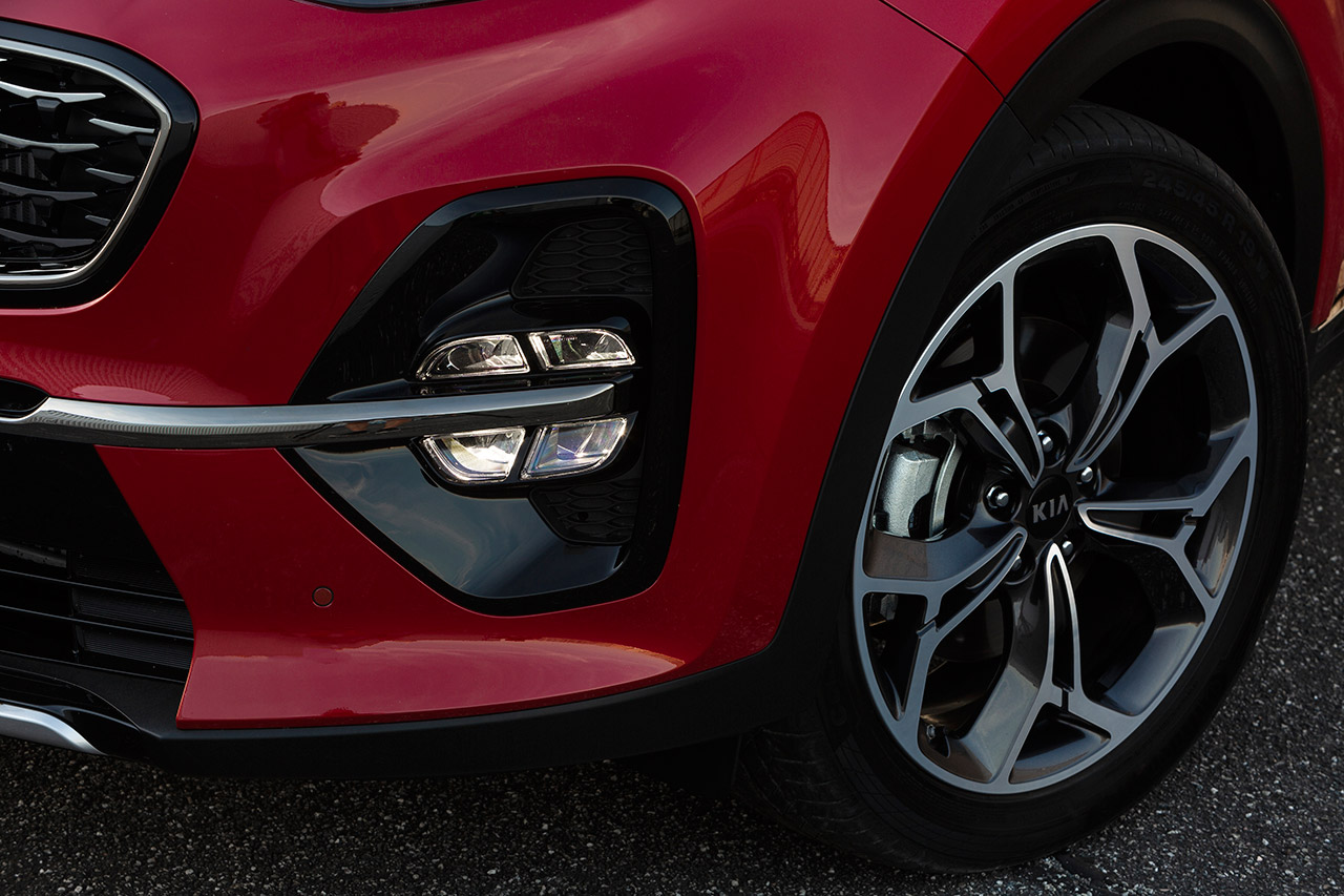 Spoilerul față a fost reproiectat incluzând acum spații noi pentru lămpile de ceață și inserții de culoare negru lucios sau argintii dinspre lămpile de ceață spre zona inferioară de admisie a aerului. De asemenea, Sportage are acum o versiune evoluată a grilei de tip ‘nas-de-tigru’, în culoare negru lucios sau mat. Noile blocuri optice cu lumini de zi în patru puncte cu tehnologie LED și lămpile de ceață redesenate oferă o vizibilitate maximă și contribuie la îmbunătățirea semnăturii optice a SUV-ului pentru un aspect mai modern. De asemenea, este disponibilă o nouă siglă metalică.