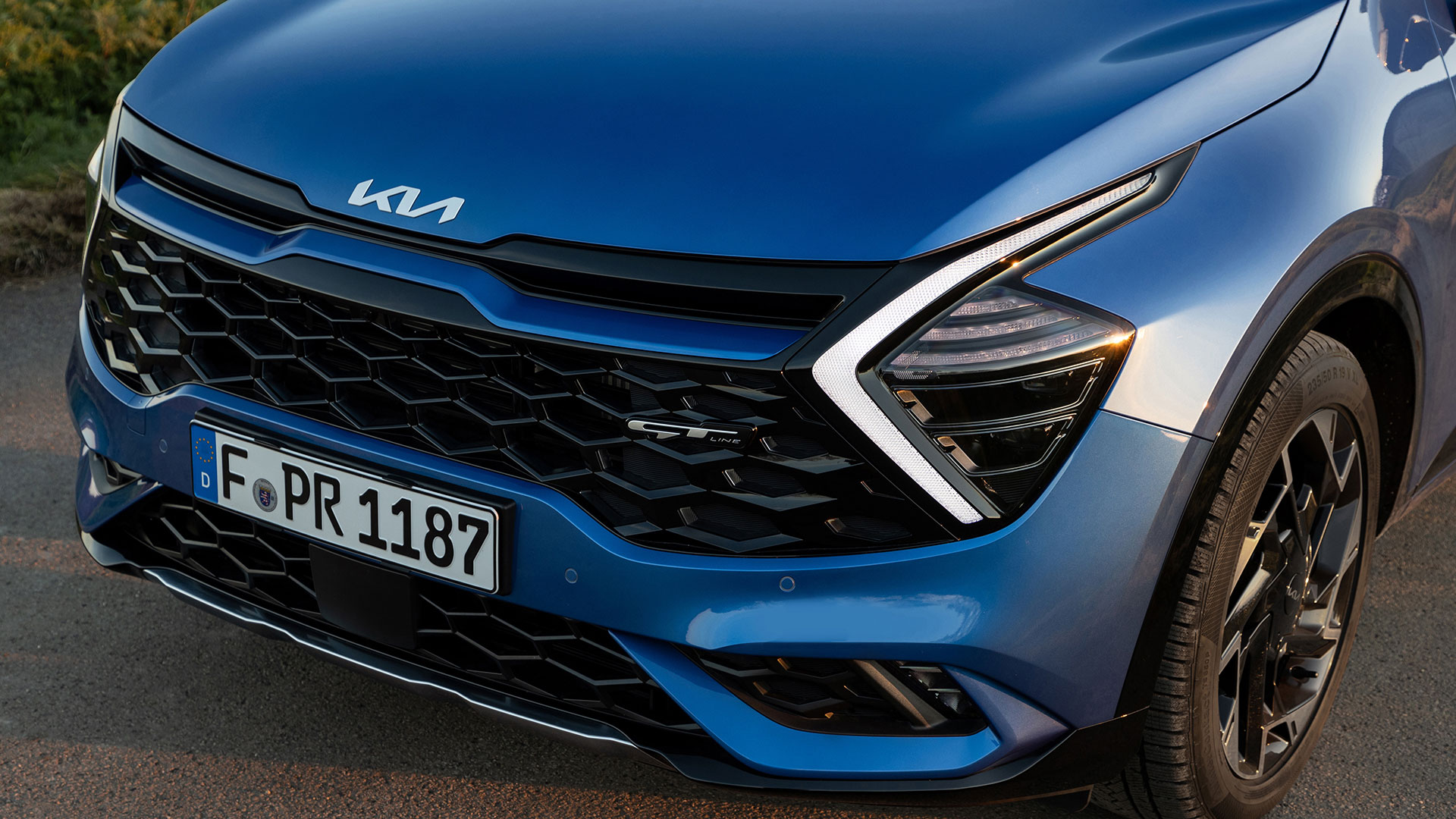 Din față, noul Sportage prezintă o formă de design precisă și complexă, cu grafica atent elaborată a grilei sale negre, care se întinde pe toată lățimea părții frontale. Grafica evoluată reunește principalele caracteristici ale părții frontale ale noului Sportage, prezentând un aspect frapant. Grila leagă semnătura Kia Tiger Nose de luminile de zi de tip DRL LED ce au un stil futurist în formă de bumerang, care la rândul lor creează linii solide de delimitare pentru blocurile optice cu tehnologie Matrix LED, cunoscute și sub numele de ”sistem inteligent de iluminare frontală”.